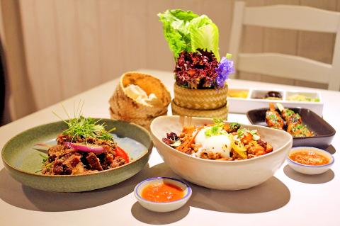 Take the duck larb (NT$450) for example. Larb, a meat salad with fresh herbs, is commonly eaten in the Isan region of Thailand, bordering Laos, where it’s considered a national dish. Here, fresh mint, a kicker tamarind dressing and sweet-sour cherry tomatoes add layers of flavor that are discernibly Thai. But when the usual ground meat is swapped out for succulent chunks of duck, served slightly warm, that tips the dish over into newer territory.