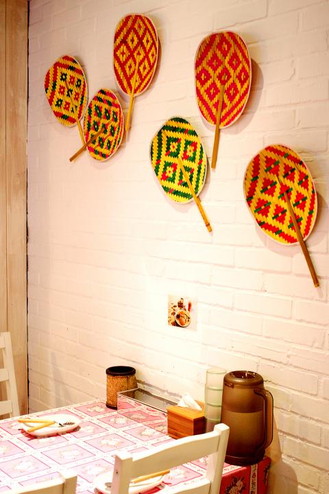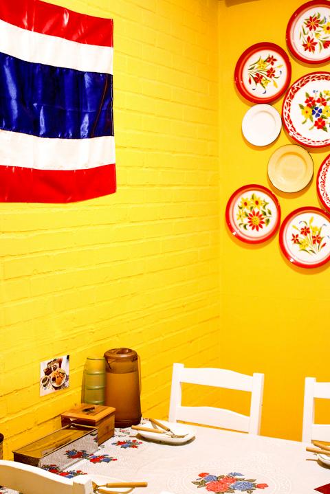 The interior is lovingly decorated with artifacts hauled back from Thailand, from ornate PVC tablecloths to flowery enamelware, bamboo baskets and a portrait of the late Thai king. The decor may be homey and familiar, but the food is decidedly not.