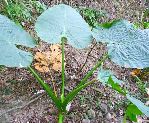 After another 1.7km, the road began to climb away from the creek. I parked my bike and proceeded on foot. In darker corners of the forest, I found a variety of ferns and several fine specimens of Elephant Ear. According to a Forestry Bureau Web page, the canopy here includes longan and lychee trees, Trema orientalis (a relative of the hemp sometimes called the Indian charcoal-tree), Taiwan copperleaf (Acalypha angatensis) and bamboo.