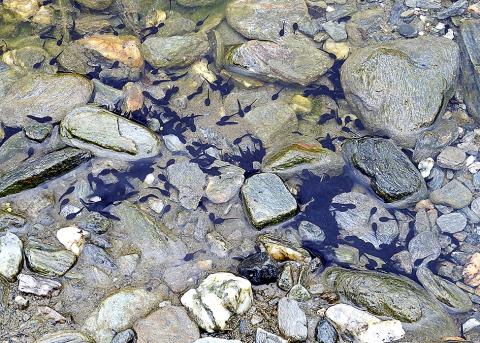 I hadn’t walked more than 10 meters before I was stopped by the sight of one of the thickest patches of tadpoles I’ve ever seen. I’ve no idea how many there were, but where the water was finger-deep, in clusters bigger than a bento box, they huddled so tightly I couldn’t see the gravel below. A few meters up the river there was another tadpole population. Then another, and another.