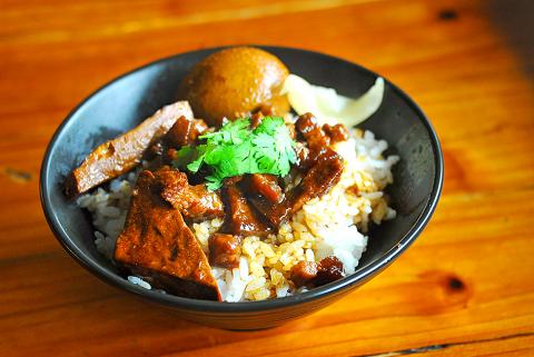 The first dish I sample actually has no tea in it — it’s a traditional Taiwanese braised pork rice bowl (NT$80) that imitates the lunch boxes served to tea pickers back in the day. Natural Tea Manor’s version of this ubiquitous dish made it into the nation’s top 10 during last year’s Taiwan Braised Pork on Rice Festival, and it does stand out — the pork is chewy and tender with the skin, fat and meat well-proportioned and distinguishable, and the flavoring is a simple soy-sauce, sugar and shallot concoction that isn’t too heavy.