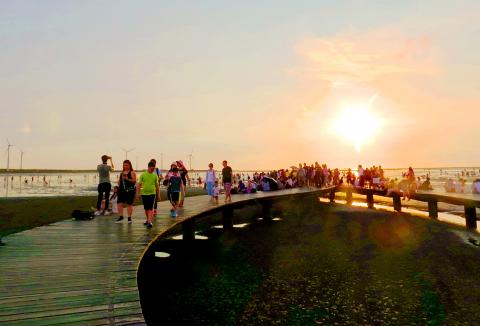 If seeing the sunset — which is often stunning — is one of your goals, check the Central Weather Bureau’s (www.cwb.gov.tw) Web site. Look for “Astronomy” on the menu, then choose Taichung in “Central Area” as your location. Between now and the end of this month, the sun will set between 5:11pm and 5:20pm. On the same Web site, if you go to “Fishery” and click on “Tidal Forecast,” you’ll find the high- and low-tide times for Qingshui under “Hsinchu-Lukang Inshore.”