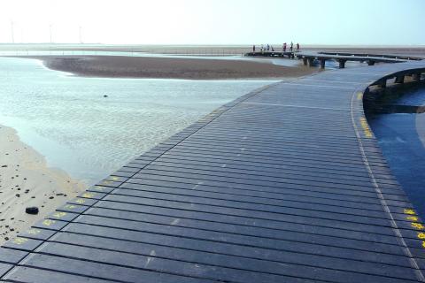 While I wouldn’t describe the scenery as beautiful, it did make for a pleasant change from the urban lowlands I’d been biking through. When I got to the end of the walkway, I noticed some tourists had taken off their shoes and set off across the tidal flats. The breakers seemed very far away indeed — but when the tide turns, how fast does the water come in?