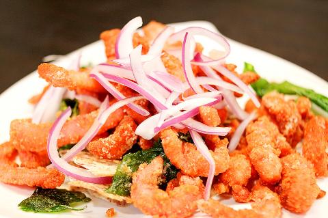 At May Snow, red yeast rice is also used to marinate squid that’s then deep-fried until airy, crisp and impressively tender. The crunch factor is cleverly raised with taro chips.