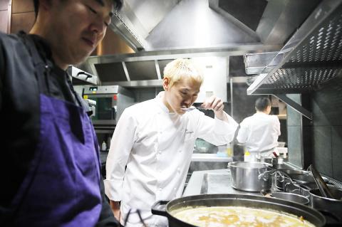 With his gelled bleached blond hair, there is something of the showman about the young blade who readily admits to driving his cooks ferociously hard.
