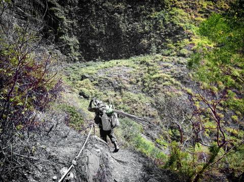 Most of the trek up is strenuous, but not dangerous until we get to within a few hundred meters of the settlement. At this point, the path narrows and much of it is carved out of the side of a cliff, a rope separating climber and the valley below.