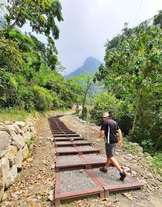 The path is just 1km long, but a lot is packed into that short distance: Lots of climbing on both wooden stairs and concrete tracks, rows of tea bushes, stands of bamboo, and when you get to the very top, almost 360 degrees of mountain panoramas.