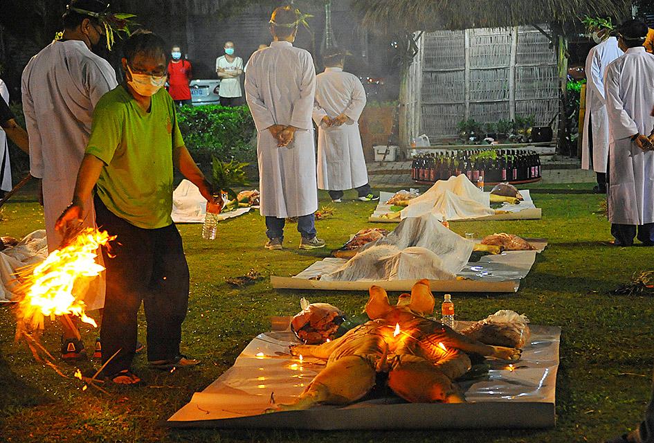 Huang Jung-fong (黃榮豐) is trembling on the ground, making retching sounds while clutching a ceremonial staff. He gets up, raises his arms to the sky and walks toward a group of white-robed villagers, delivering divine instructions that kick off the Pataran community’s annual Night Ceremony (夜祭).