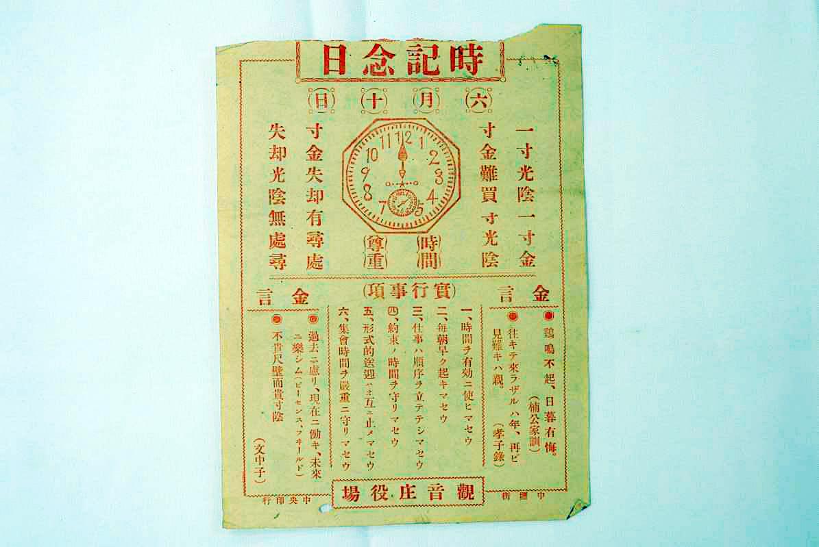 The concept of time became pertinent to every citizen after the colonial government launched the Kominka Movement (皇民化運動) in the 1930s to shift Taiwanese culture closer to that of Japan. As World War II heated up, the government tightened its control over people’s lives, mobilizing them into various groups and collectives to rally their patriotism and support the war effort.