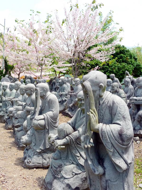 A patch of land near the parking lot is populated by gray statues of arhats, individuals who have made great progress toward enlightenment, but have not attained a state of Buddhahood.