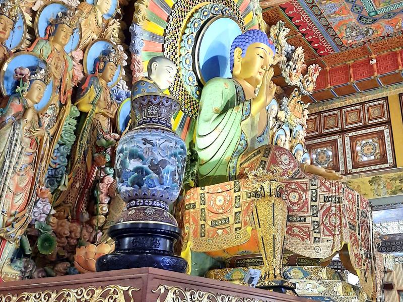 The main hall is gloriously colorful, and the Shakyamuni Buddha has a head of vividly blue curls. Hair of this hue is one of the Buddha’s 32 distinguishing physical characteristics. Next to the altar, there’s a concert piano. I don’t think I’ve ever witnessed a Buddhist service that included piano music.