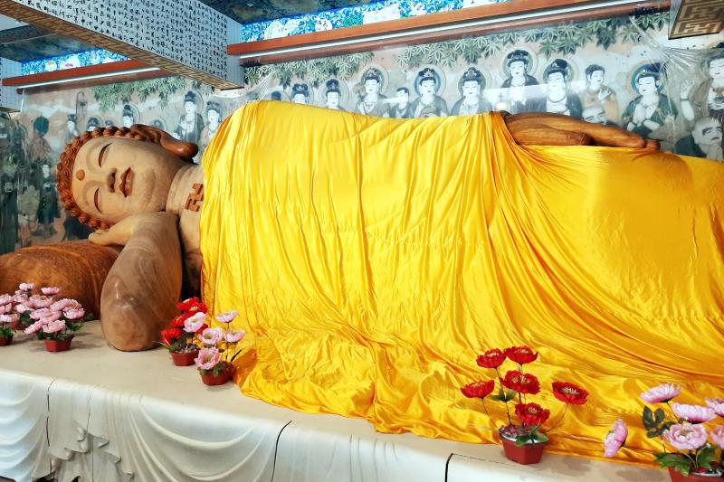Another highlight within the complex is a striking Reclining Buddha. Weighing seven tonnes, 7.5m in length, and carved from a single camphor tree, it’s claimed to be the largest camphor-wood Buddha in East Asia. An adjacent chamber held a somewhat smaller Buddha, also reclining and still wrapped in plastic.
