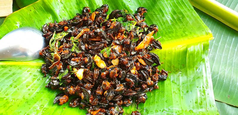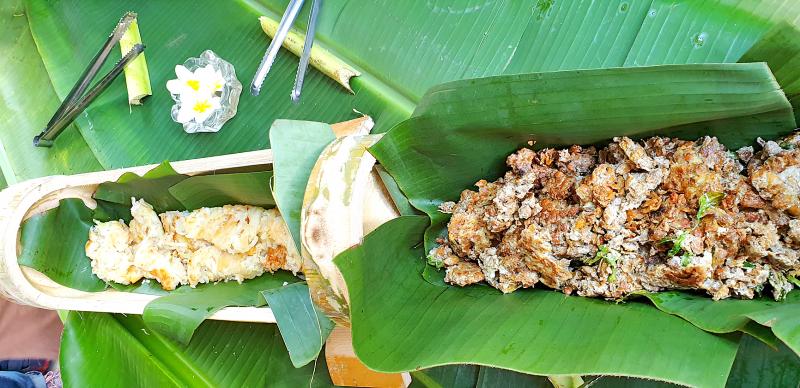 Lunch was a feast of local ingredients and deliciously cooked dishes laid on banana leaves, served in neatly cut and carefully arranged bamboo boats.