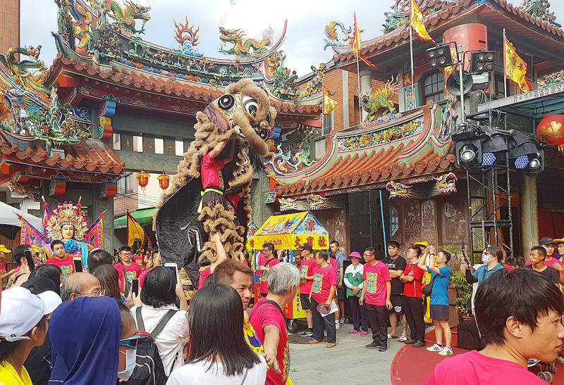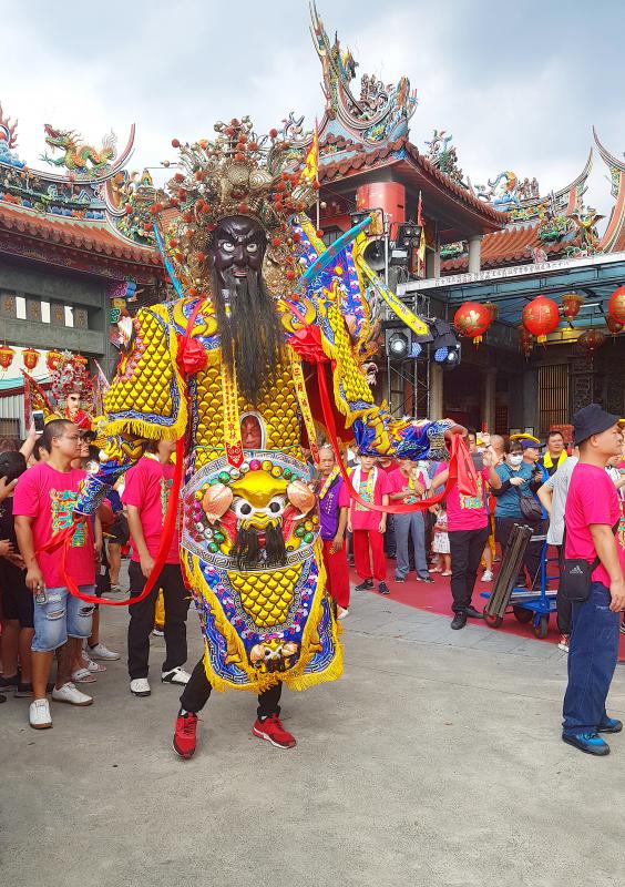In addition to parading Guan Gong (關公), the temple’s patron deity and the Chinese god of war and martial arts, around Dasi today and tomorrow, the festival has included music performances that combine temple tunes with rap, exhibitions of photos of temple volunteers and local artisans, as well as an installation on how to make a vow to the god.