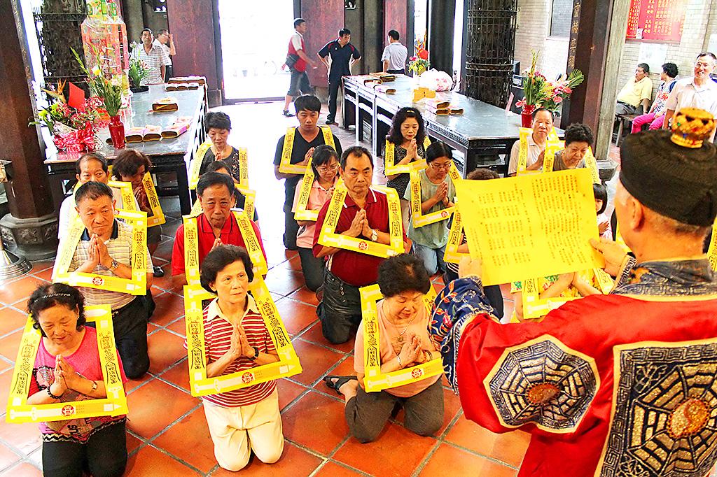 She was rude to her parents, feuded with coworkers and often succumbed to greed. So when Chiayi’s Cheng Huang Temple (城隍廟) started offering “cangue processions” (夯枷) in 2014 at end of Ghost Month, Liu immediately signed up, she told the Liberty Times (Taipei Times’ sister newspaper).