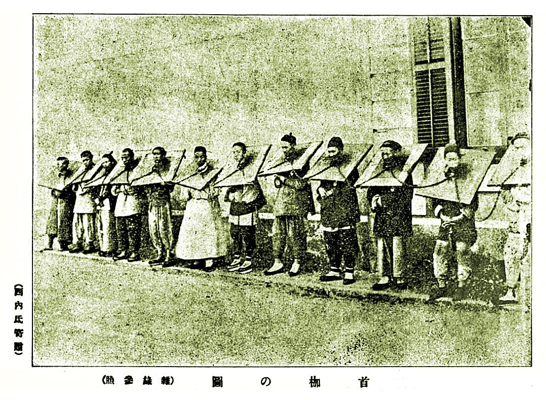 A cangue is a large wooden board that was fitted around a criminal’s neck, a practise dating back to antiquity. Some included holes for arms. During the Qing Dynasty, a cangue could weight up to 40kg, and prisoners were paraded around the streets as a form of torture and humiliation.