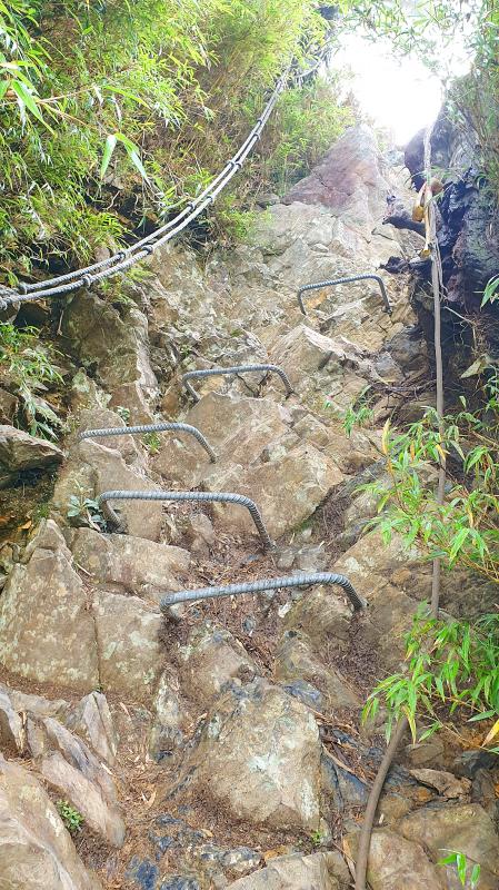 Due to later-day inclement weather, the best views of the trip came early at the lookout point at about 3.8km up the trail. It was clear enough that we could make out the skyline of Kaohsiung and the offshore island of Siaoliouciou (小琉球). After pausing for a snack and photos, we mosey on. It’s about 2,150m here, meaning that there’s almost another 1,000m to cover. The “trail” — if you could call it a trail anymore, gets increasingly difficult from here as you’ll be grappling, scaling and pulling yourself up various obstacles, with only the occasional flat stretch for respite.
