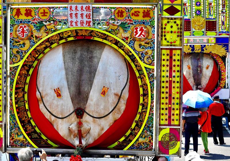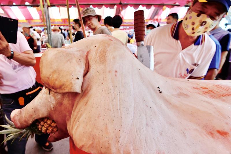 To a fanfare of traditional music played on gongs and horns, 18 slaughtered pigs were wheeled out on trucks Monday into the Hsinpu Yimin Temple in Hsinchu County .