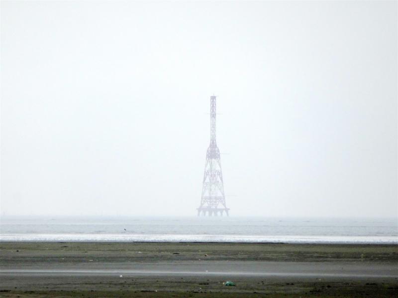 Stepping off the boat onto the sandbar, it’s hard to imagine this place once had over 1,000 inhabitants. All one sees now is an enormous expanse of dark sand barely a meter above sea level, littered here and there with abandoned oyster farming equipment and random refuse from the ocean. Far to the east, taller buildings along the coast of Chiayi are visible. To the north, it’s sand as far as the eye can see. To the west, the rougher waters of the Taiwan Strait can be seen, as the sandbar is now less than 1km wide where the tourist boat beaches. Finally, to the south, there is a peculiar sight: a steel structure several stories high.