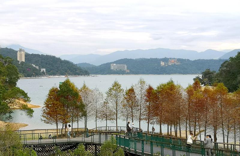 From here, we have just a dozen of the day’s 65km left up Provincial Highway 21 to Sun Moon Lake (日月潭), but almost half the 900m remaining to climb. The ascent is not onerous, however, and the traffic is much reduced, making for a pleasant ride and a 6 on the Eureka Scale as we crest the final hill and see the tranquil waters of Taiwan’s largest lake and surrounding autumnal trees spread out before us; a paradise at the center of Taiwan (well, about 10km south of the absolute geographic center to be exact).
