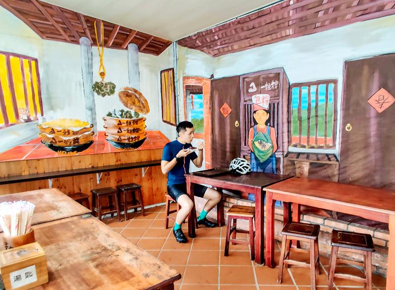 Finding the locally renowned restaurant Yilizong (一粒粽) is open and has vegetarian sticky-rice options, Huang takes a snack among the murals depicting a traditional Taiwan eatery.