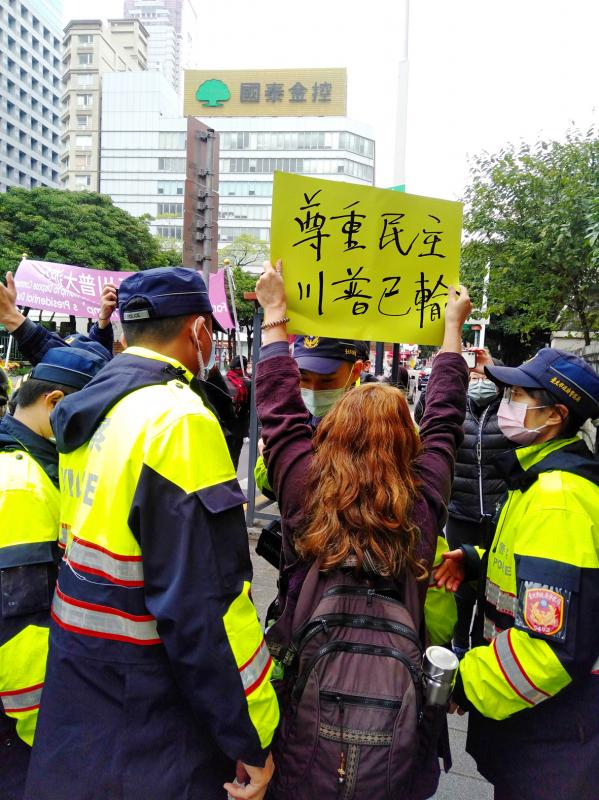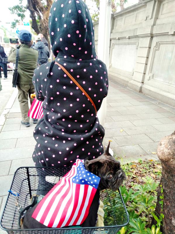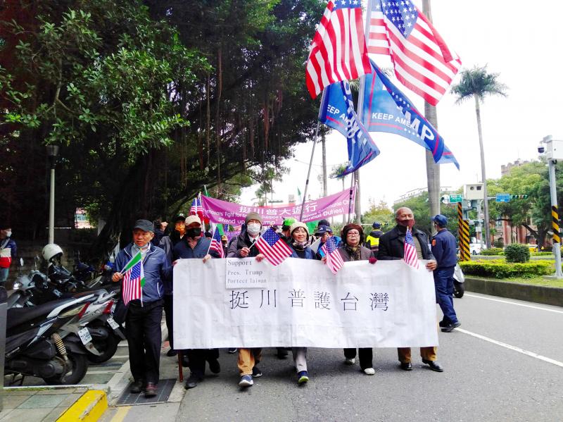 “I don’t want to talk about Taiwanese sovereignty here,” says Tsai Pai-chuan (蔡百銓), a historian with over 50 books to his name. “Of course, I support independence but that makes people nervous,” he says. “I’m just here to show my gratitude to Trump.”