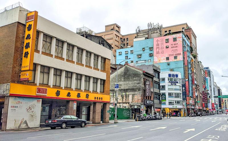Hang a left on Kaifeng Street (開封街) and turn right on Chongqing S Road (重慶南路), where the crowd continued their march south. Their first destination, the Taipei branch of the Tobacco and Liquor Monopoly Bureau, is immediately visible with its bright-yellow Chang Hwa Bank (彰化銀行) signage. Aside from the modern signage, it looks almost the same as it did when it was built in 1929.