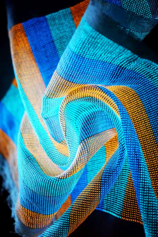 At first glance, the fabric looks like a pretty if not especially original scarf, with turquoise, blue and orange stripes in an open weave. But this fabric can communicate.