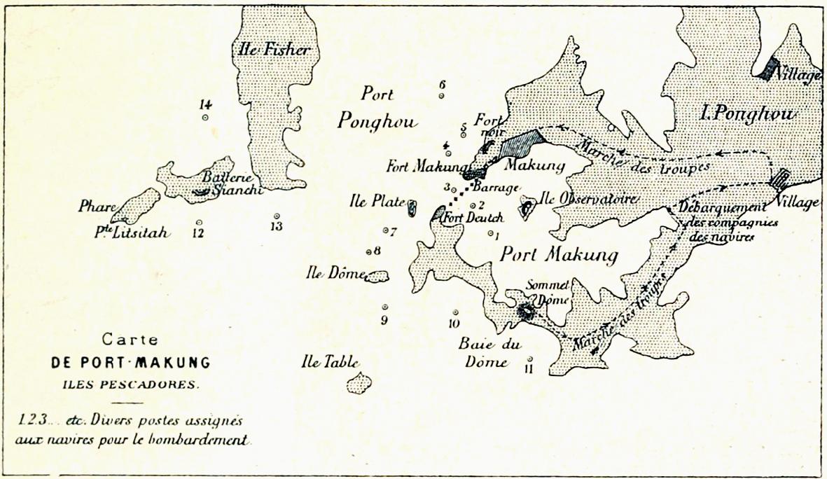 On March 29, French admiral Amedee Courbet led an invasion of the archipelago near the end of the Sino-French War, routing the Qing forces and capturing the town in three days. Coppin was a physician on the cruiser Nielly, and his letters to his mother, translated into Chinese in 2013 by Julie Couderc, provide first-hand information on the condition of Magong under its brief French occupation.