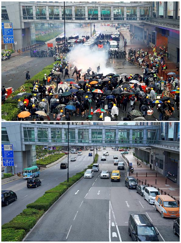 Suspended footpaths that protesters used to launch petrol bombs have been covered with fences and barbed wire. Plastic, water-filled barriers surround and protect administrative buildings, forcing pedestrians to cross to the other side or walk through a narrow corridor in between the barriers and police in riot gear standing guard.