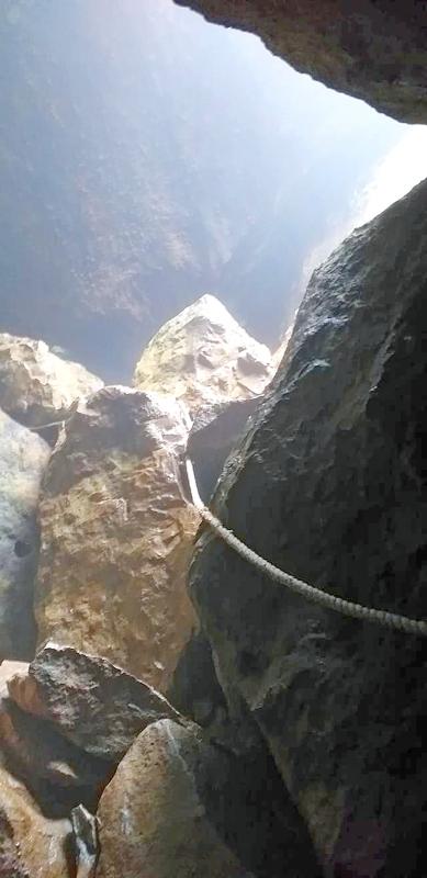 The main mountain section ends with a steep drop down a natural chute, where two thick ropes lower you to safety. It seems like it’s over and that the going should be easy. But you’re not off the mountain yet.