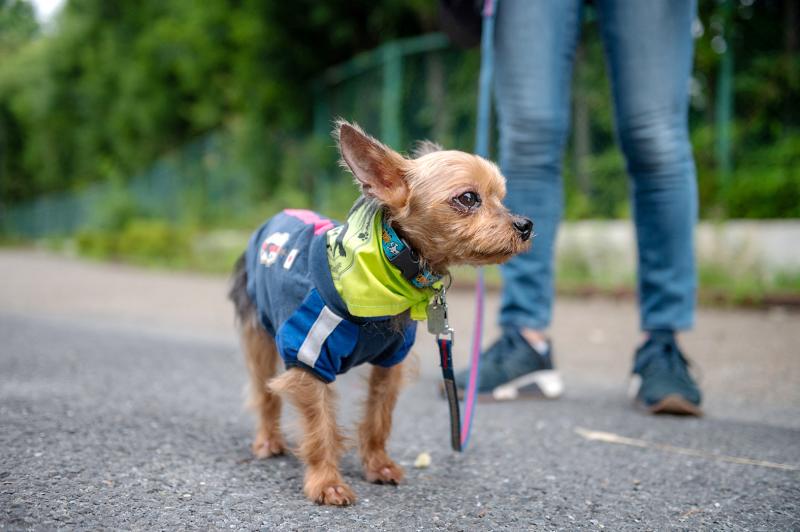 Pu, a 17-year-old shih tzu, is one of the oldest members of the patrol and can no longer walk by herself. But she proudly participates from the comfort of a doggy stroller pushed by her owner.