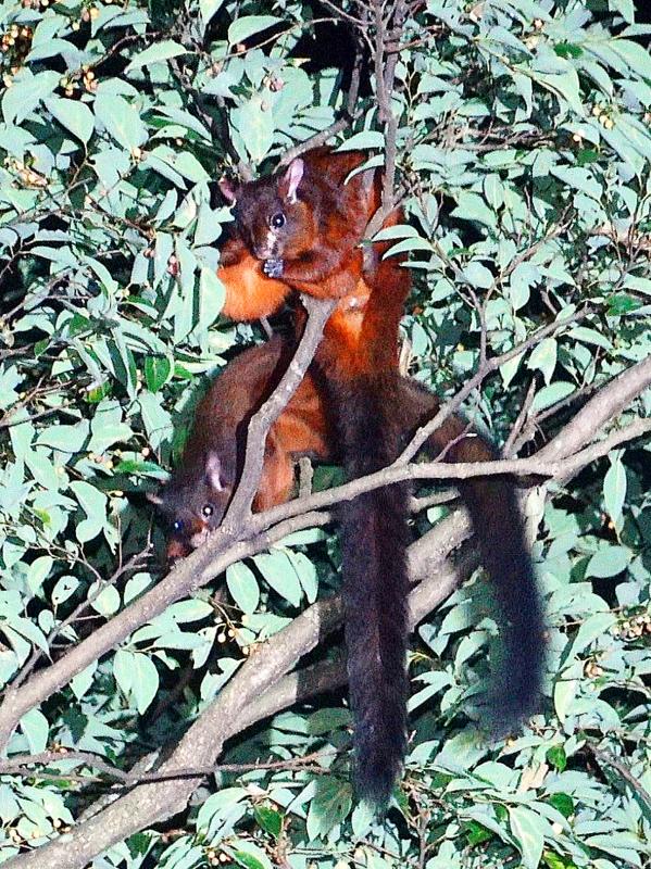 Above us, we catch a glimpse of a pair of giant flying squirrels nibbling on fruit, their long tails hanging down.