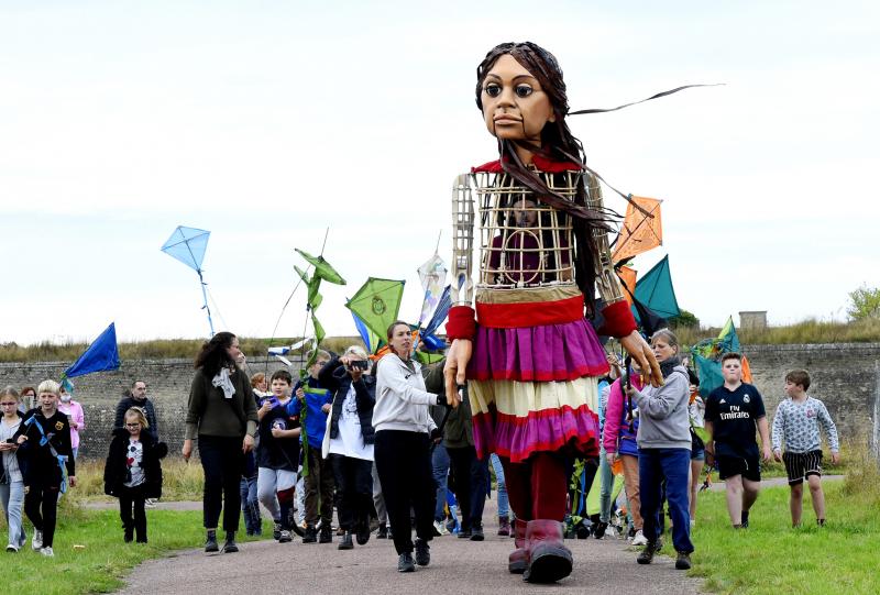 Bells will chime and choirs will sing as Little Amal appears on the beach today in Folkestone, Kent, after making the same cross-Channel journey that has been taken so far this year by more than 17,000 people seeking refuge from conflict, hunger and persecution. On the last leg of her journey, Little Amal will visit Canterbury, London, Oxford, Coventry, Birmingham, Sheffield and Barnsley before the extraordinary and complex 14-week traveling street theater ends in Manchester on Nov. 3.