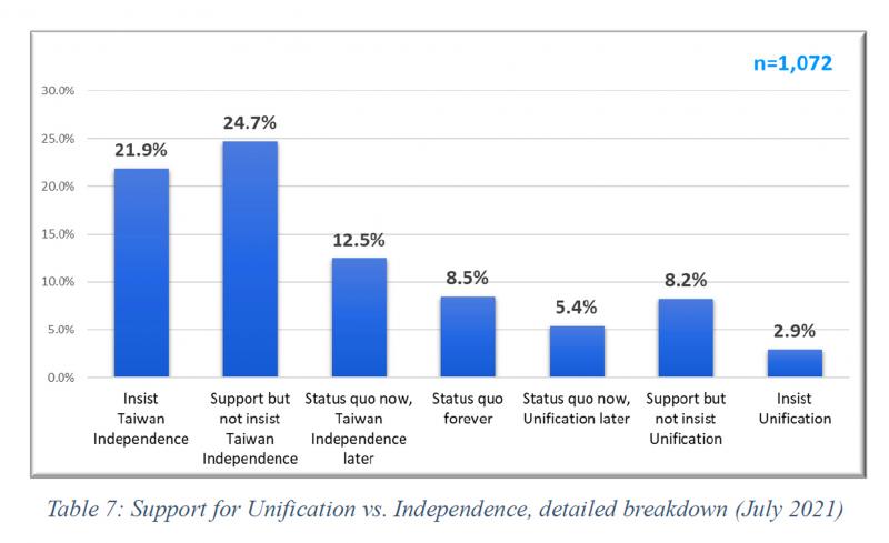 The TPOF interrogated the status quo in other ways. It asked whether people insist on Taiwan independence (21.9 percent), support but not insist on independence (24.7 percent), status quo now, independence later (12.5 percent), status quo forever (8.5 percent) and then mirrored the first three questions for the pro-China side (16.5 percent total for all three pro-China questions).