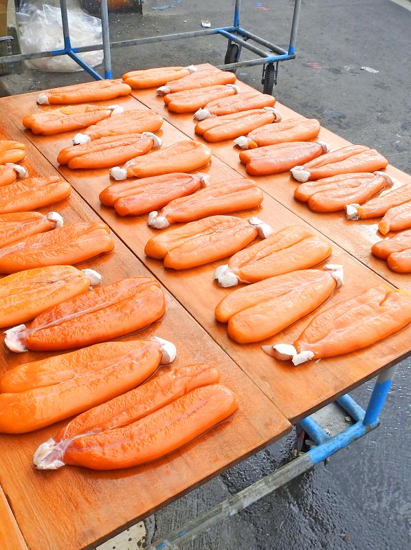 Approaching from the south via Expressway 61, I overshot and found myself on the edge of central Kouhu, close to where a man and two women were washing slabs of salted mullet roe (烏魚子), then setting them out on long tables to dry.