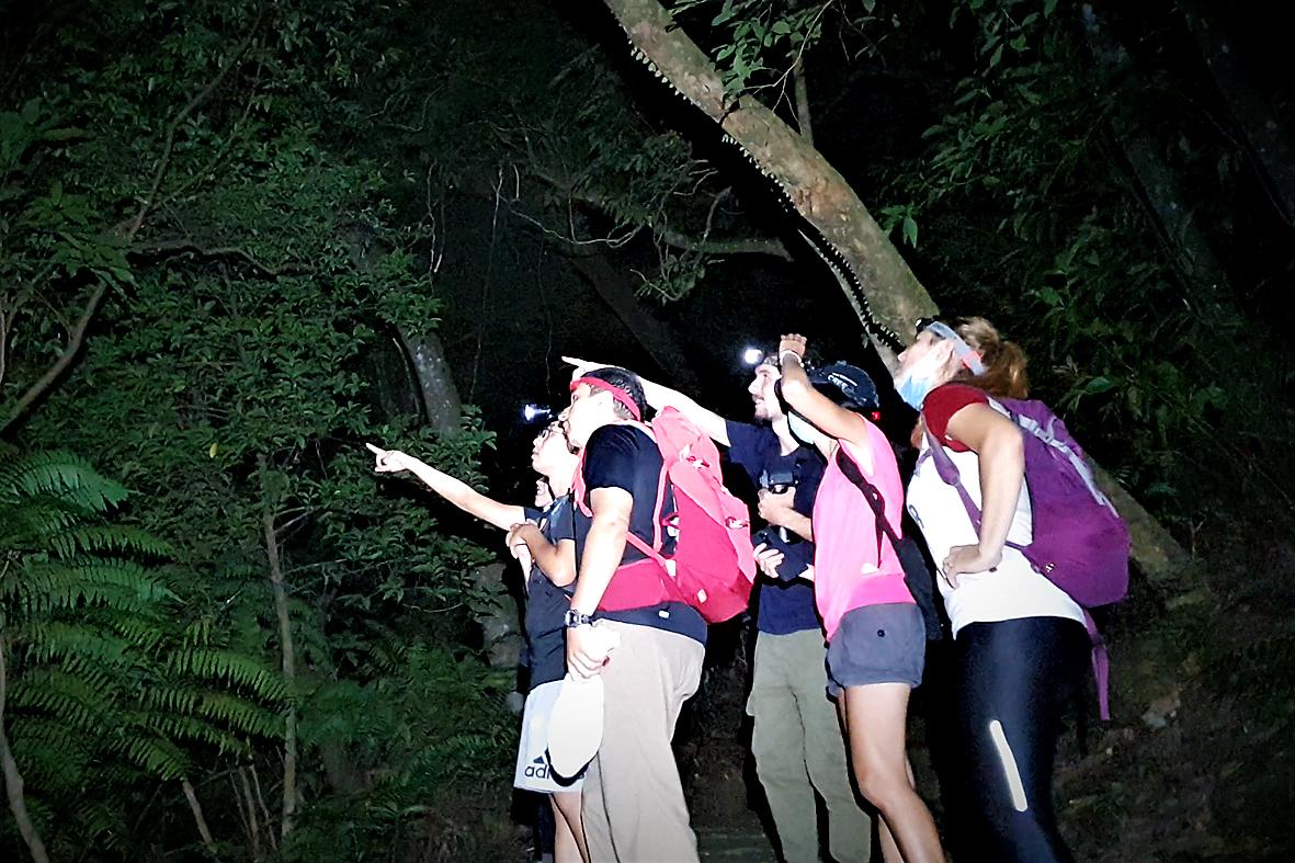 As we descend from Old Place Lookout (老地方觀景平台), a collared scops owl (Otus lettia) swoops over-head and lands in a tree in front of us. Seeing that we were not mice, it turns and flies off back into the dark forest.