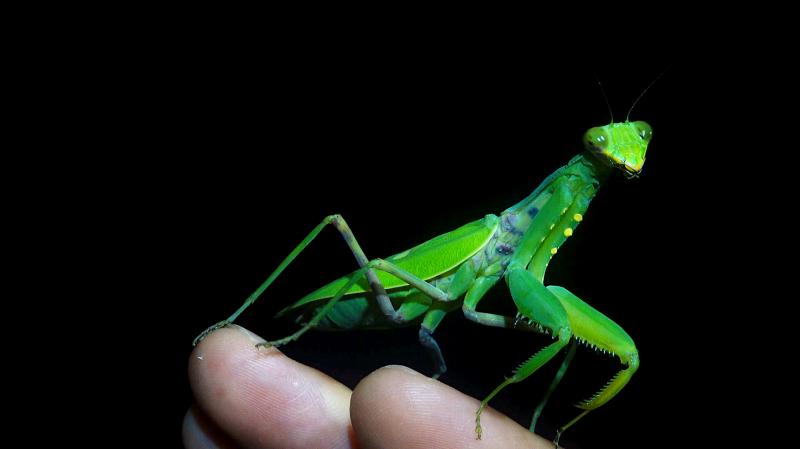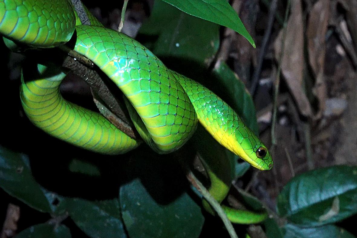 In our haste, someone bumps into a green snake on a trail-side branch. Startled, the snake leaps off its perch as we all step back. Not to fear, I explain to the group, unlike green tree vipers (Trimeresurus stejnegeri ), greater green snakes are not venomous.