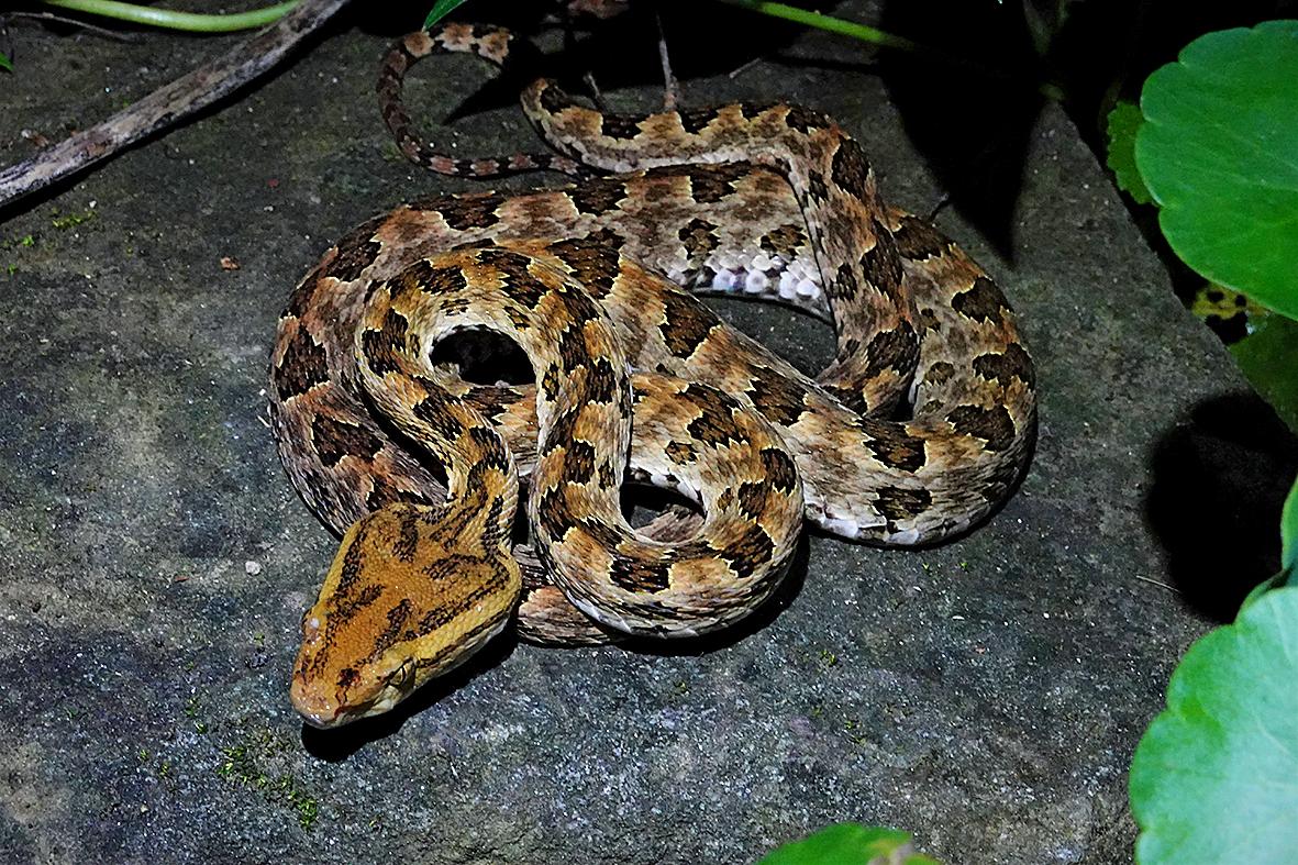 As we pick up the pace we nearly miss a tiny baby mock viper (Psammodynastes pulverulentus) immobile on a branch next to the path. Further on, we see a non-venomous greater green snake (Ptyas major) sleeping on a shrub. Shortly after, a Taiwanese tree snake (Boiga kraepelini) gracefully glides through the branches of a tree over-head.