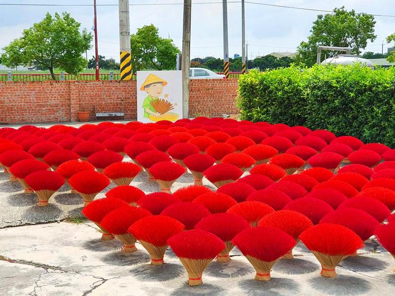 When I dropped by, the production area was closed to non-staff, and the incense sticks drying outdoors were a boring shade of brown. Even so, I learned a few things from one of the employees. The raw materials from which this century-old business makes incense are mostly imported from Australia, Indonesia or Vietnam. The incense sticks they usually make are priced from less than NT$1,000 per 600g packet to more than NT$3,000. But, the employee told me, they sometimes receive orders to manufacture incense that costs over NT$30,000 per taijin (600g).