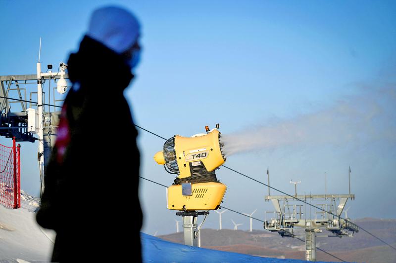 The stark white patches stand out vividly against Yanqing’s brown mountains, which see minimal natural snowfall. An International Olympic Committee evaluation report said that Zhangjiakou (張家口) and Yanqing — the Games zones hosting alpine skiing and snowboarding, among other outdoor events — “would rely completely on artificial snow.”