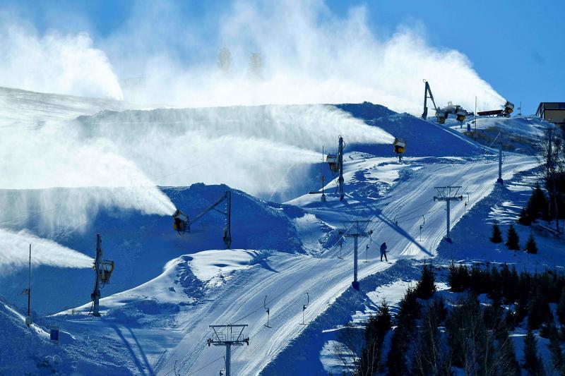 Fed by local reservoirs, about 300 turbines — known as “snow guns” — mix water with compressed air before propelling the droplets into the air to form snow.