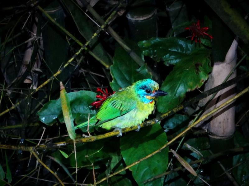 We are not disappointed, as sleeping beside the ridge top trail is a beautiful Taiwan barbet (Psilopogon nuchalis), also known in Chinese as the “five-color bird” (五色鳥) due to its many colors. Brilliant green, with patches of red, orange, yellow and blue around their faces, these birds are the jewels of Taiwan. Although common, they tend to be hard to see high in the tree-tops. We are lucky to get a close look at one on its sleeping perch so close to the trail.