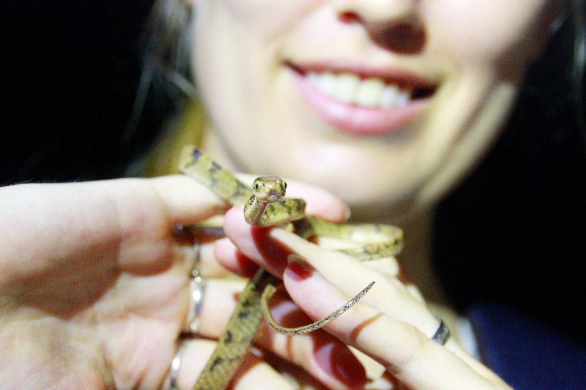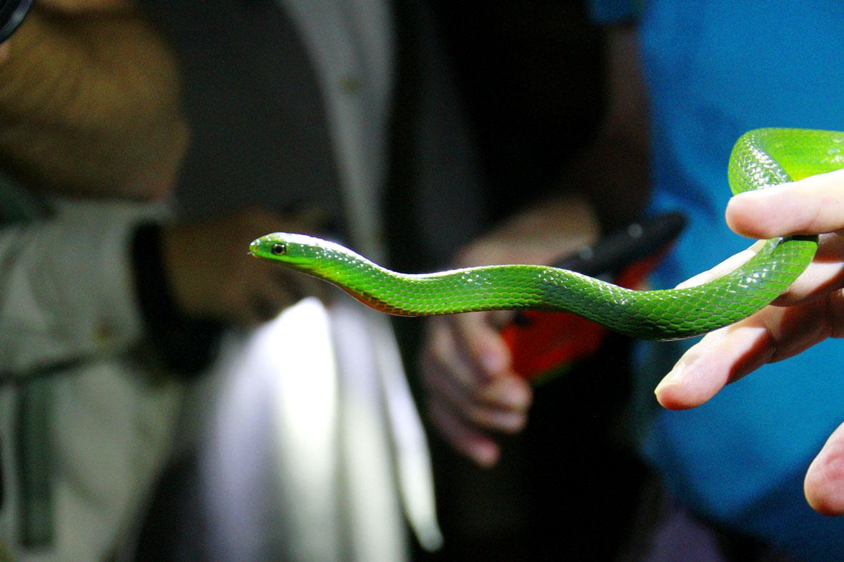 It is best to avoid handling wildlife, but with so many of our group on their first night hike tonight, having a closer look is such a good educational opportunity. We carefully bring it down and let it crawl from arm to arm. These are docile snakes, and will remain quite relaxed if not gripped. It is always good to showcase how peaceful snakes can be.