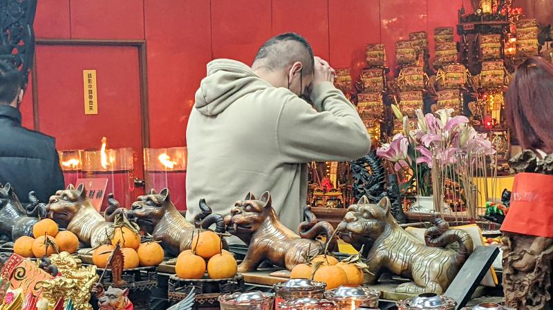 Temple director Hsu Ping-tsung (許炳宗) says that’s because the feline god in his place of worship — one of just a handful in Taiwan with the Tiger Lord as a principal deity — is of Buddhist origins. Before its deification, it was the mount of one of the 18 Arhats.