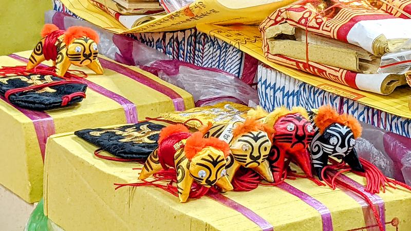 Each stack of spirit money is accompanied by one or many tiny stuffed tigers containing the Tiger Lord’s incense ash, most of them yellow. Hsu explains that each year, the Tiger Lord picks a color representing the Five Elements — this year happens to be yellow, which represents wealth.