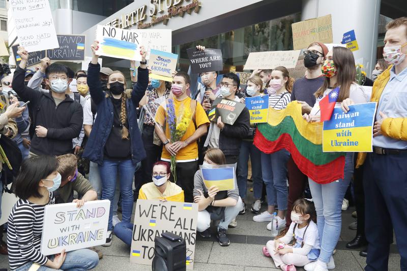 Solidarity and steadfastness. These qualities were evident among Ukrainians long before missiles began pulverizing their cities early Thursday morning. They were on display again on Friday and Saturday in Taipei’s Xinyi District (信義), where hundreds of people gathered outside the building housing the Russian representative office.