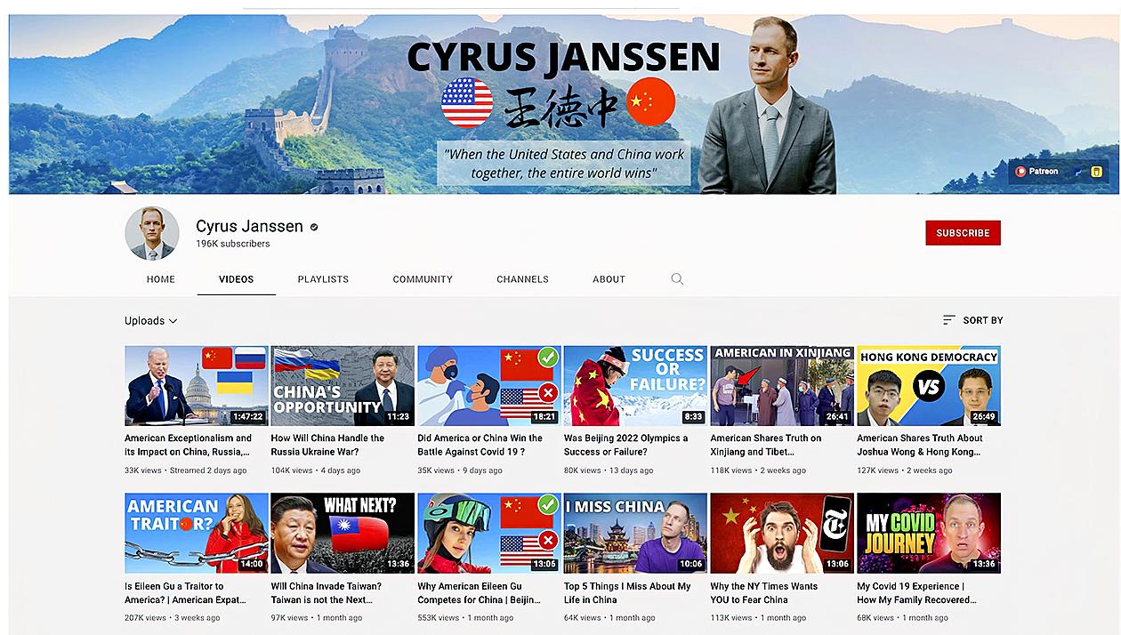 The video topics are often in sync with those of other pro-China bloggers such as Cyrus Janssen, a US citizen living in Canada. During the Olympics, Janssen and Lightfoot both shared videos celebrating Gu’s three-medal win, using identical images of the Olympian, though Lightfoot also poked fun at President Joe Biden.