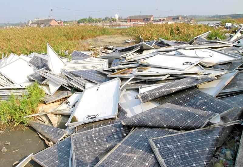 On Nov. 8, 2018, the Liberty Times (Chinese-language sister paper of the Taipei Times) reported that local government employees were removing 800-odd typhoon-damaged solar panels that had been dumped beside a fish farm in Changhua County’s Dacheng Township (大城). The authorities were also trying to identify the individual or company responsible, as improper disposal of industrial waste can result in a fine of up to NT$3 million.