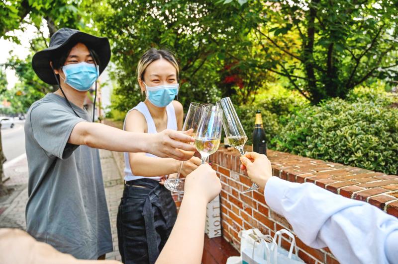 A masked quartet of friends toasted their brief freedom with champagne, while a group of older women put on their Sunday best for a long-awaited stroll through the neighborhood.